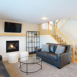 For this remodel we refaced the fireplace with a white subway tile and had a custom mantel made to match the existing maple banister. We had all the walls repainted Sherwin Williams Agreeable Gray and carpet replaced in the living room and primary bedroom. We added floor tile under the kitchen buffet and selected new light fixtures in a matte black finish. For this project we also helped with furnishings, window treatments, and decor.